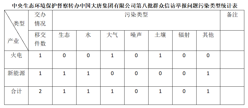 2025年6月11日,中央第七生態(tài)環(huán)境保護(hù)督察組向中國(guó)大唐集團(tuán)有限公司移交第八批群眾信訪舉報(bào)件,共計(jì)2件,均為來電舉報(bào),涉及生態(tài)問題1個(gè)、水問題1個(gè)、大氣問題1個(gè)、土壤問題1個(gè)、其他問題1個(gè)。所有舉報(bào)件辦理工作已第一時(shí)間進(jìn)入調(diào)查核實(shí)辦理程序,辦理情況將按照相關(guān)要求反饋督察組,并及時(shí)向社會(huì)公開。