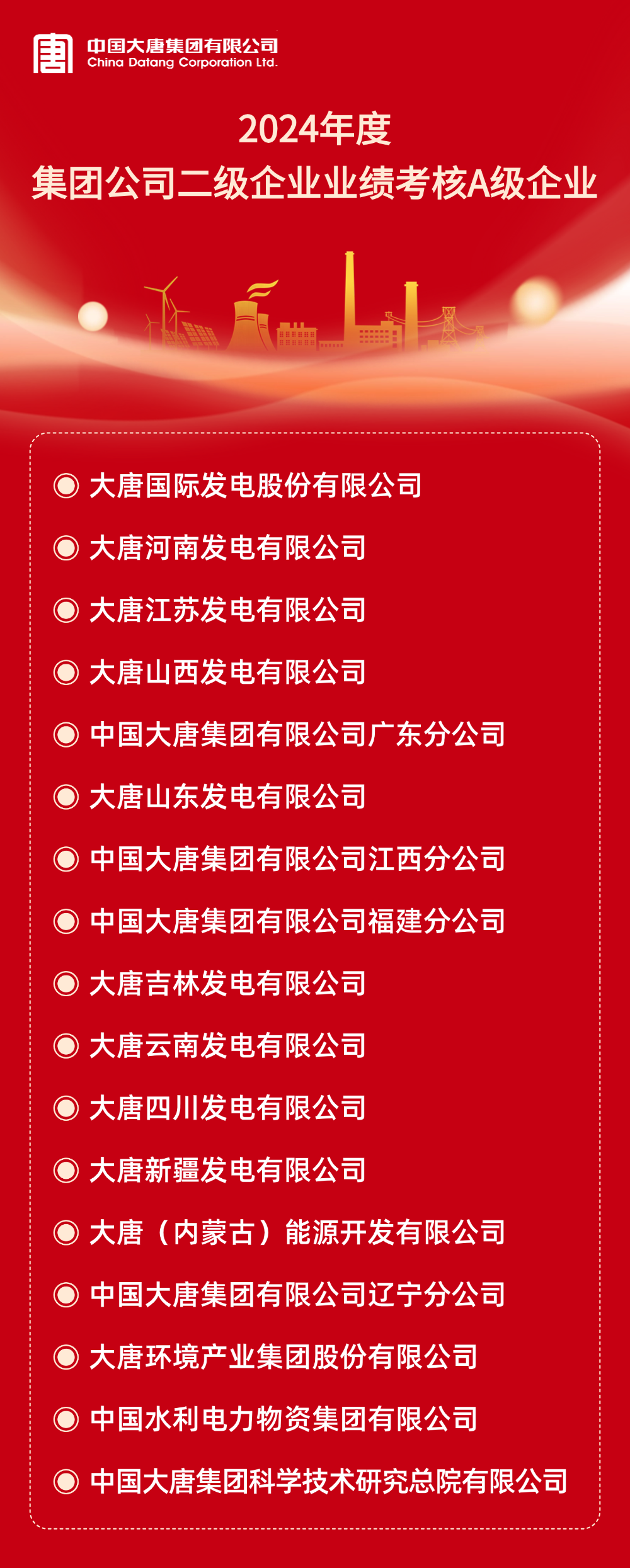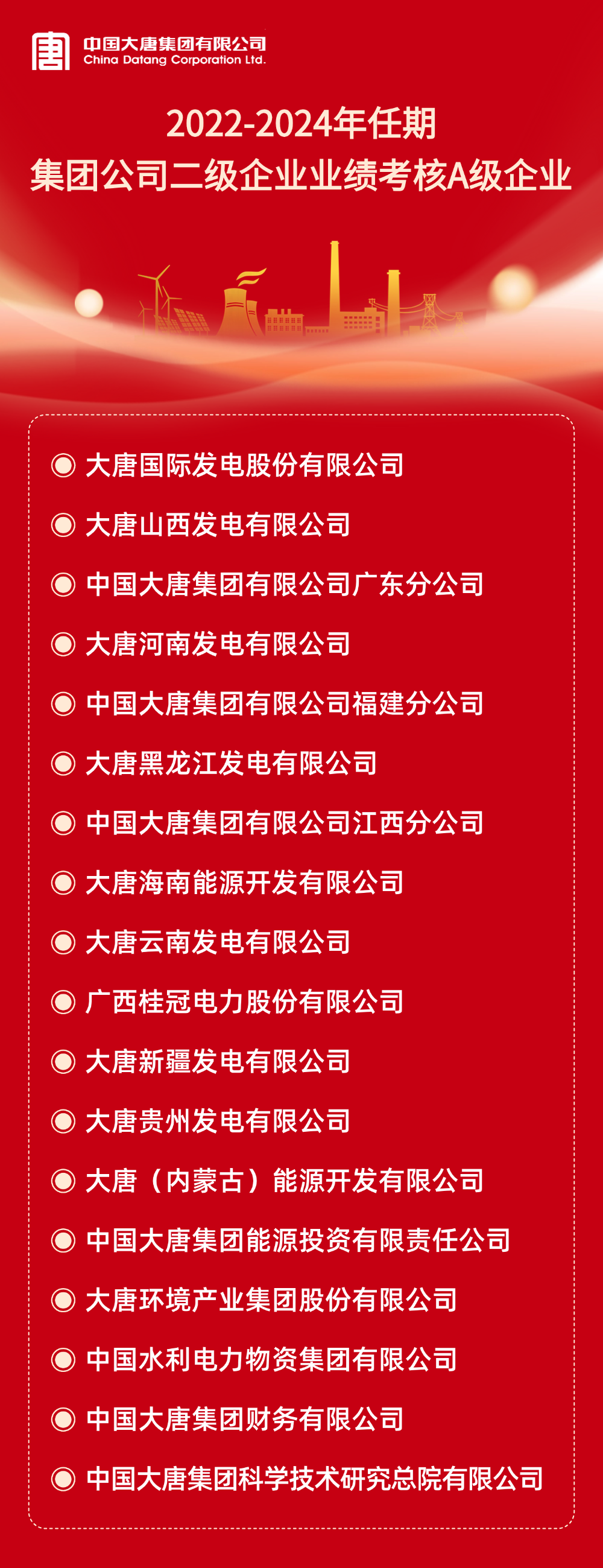 本網(wǎng)訊 根據(jù)《中國大唐集團(tuán)有限公司所屬企業(yè)年度業(yè)績考核辦法》和《中國大唐集團(tuán)有限公司所屬企業(yè)任期業(yè)績考核管理辦法(試行)》及有關(guān)規(guī)定,2024年度及2022-2024年任期二級企業(yè)業(yè)績考核結(jié)果已經(jīng)集團(tuán)公司董事長專題會(huì)審議通過。A級企業(yè)名單如下: